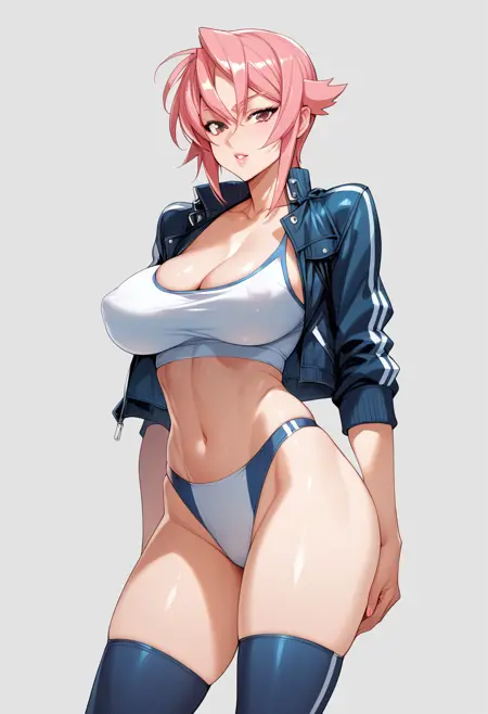 misahound, large breasts, pink hair female, short hair, jacket, covered nipples, thighhighs, cleavage,