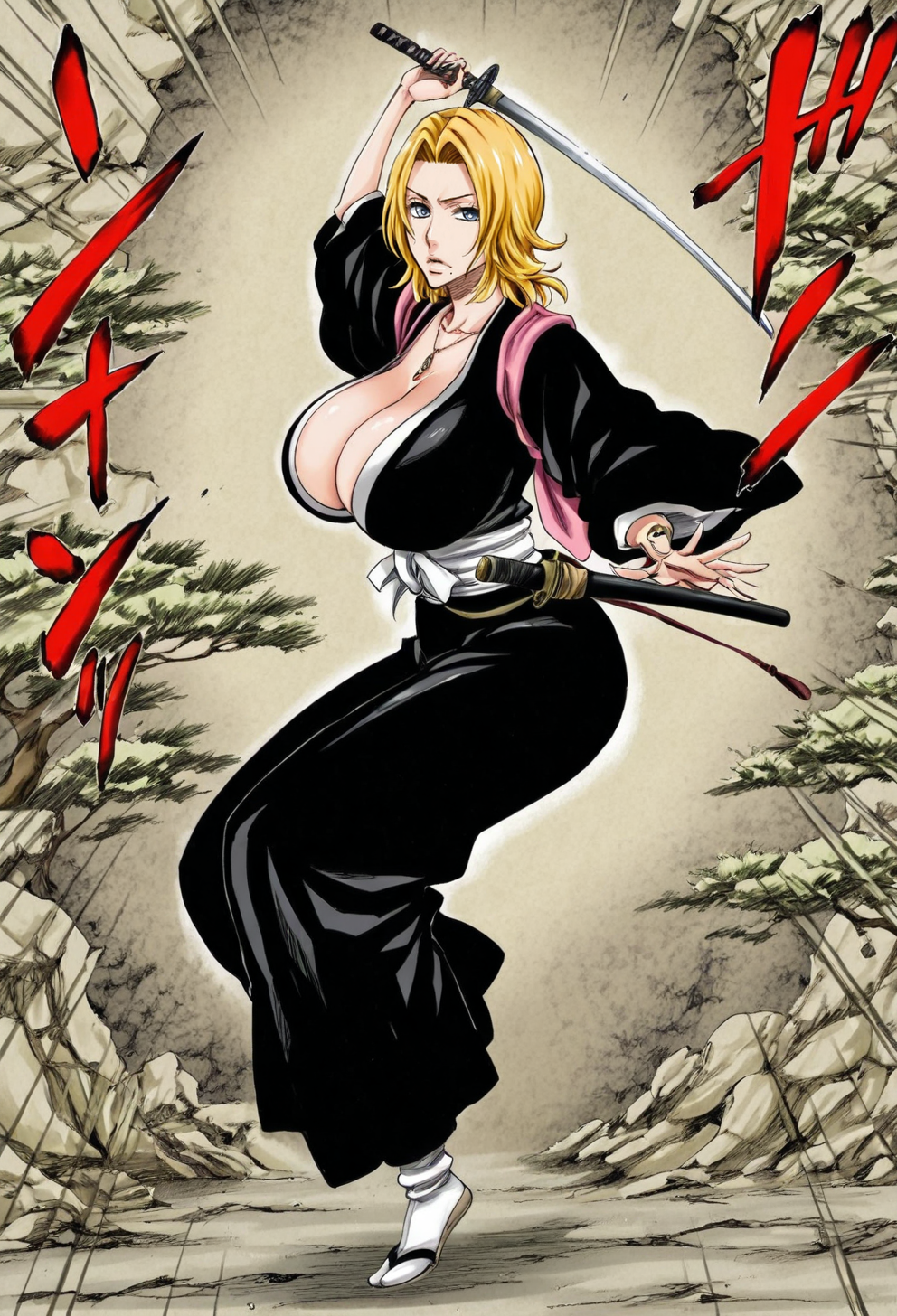 금발, 짧은 머리, 가슴 선, 일본식 검은 옷, 보석, 무기, 검, 스카프