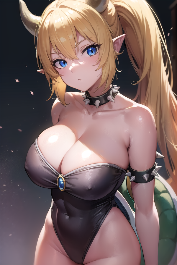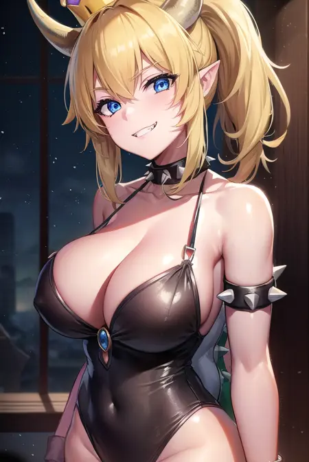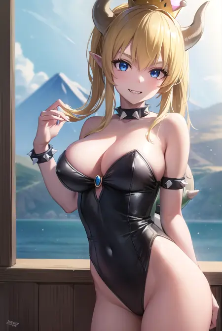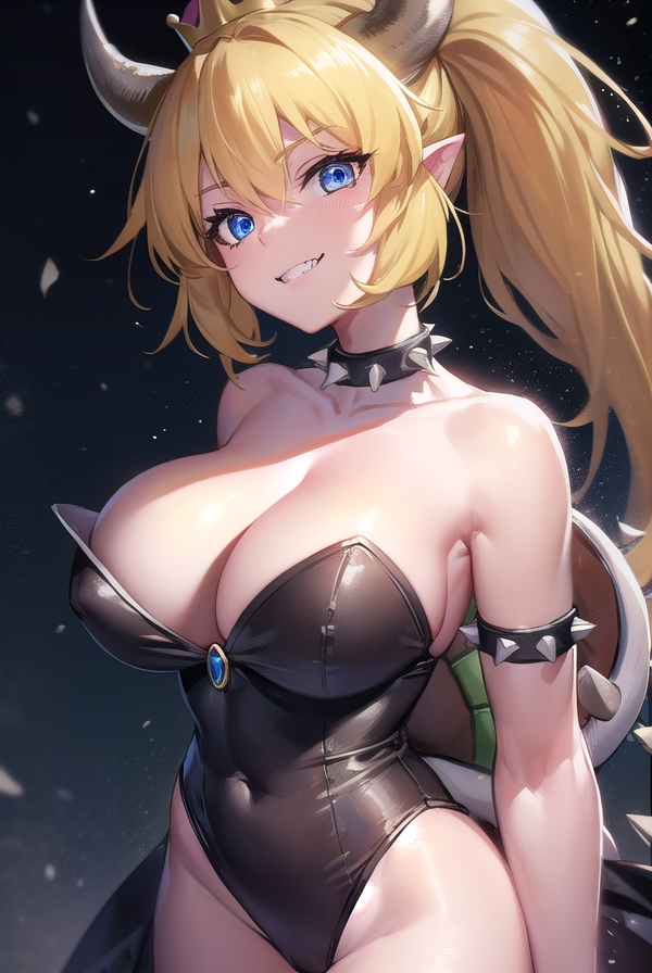bowsette, 파란 눈, 금발, 플랫테일, 중간 길이 머리, 옆머리, 뾰족한 귀, 뿔, 왕관, 미소, 이빨, 이빨,