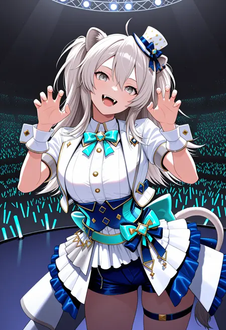 B0tanIdl, grey eyes, grey hair, long hair, ahoge, two side up, animal ears, tail, ear piercing, mini top hat, white hat, teal bowtie, white jacket, cropped jacket, short sleeves, white shirt, wrist cuffs, blue corset, waist bow, white skirt, showgirl skirt, blue shorts, thigh strap