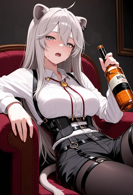 B0tanAgnt, grey eyes, grey hair, long hair, ahoge, straight hair, animal ears, tail, ear piercing, bolo tie, red tie, dress shirt, white shirt, long sleeves, black vest, black shorts, legwear garter, black pantyhose