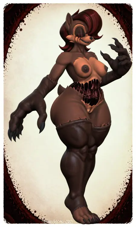 タグ: minx_sallyALT、茶色い毛、赤い髪、ファーリー、血の涙、閉じたスウェンの目、長い爪を持つ巨大な手、肌、縫い目、露出した躯体、ホラー、鋭い歯