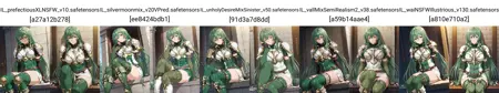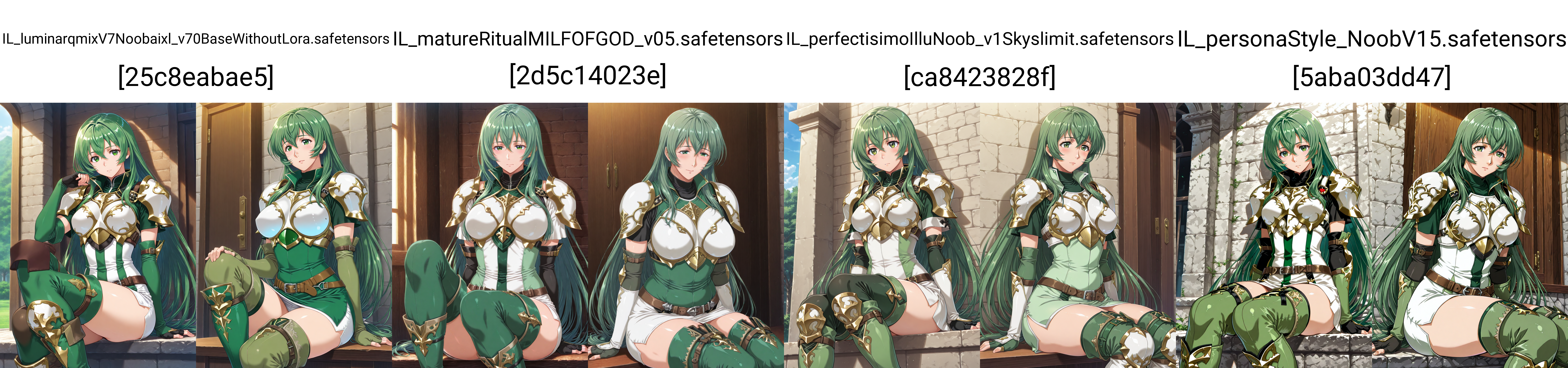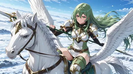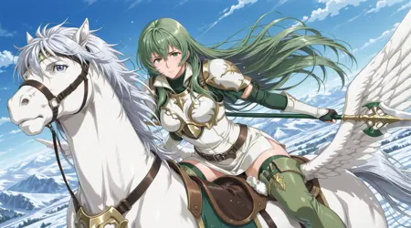聖戦の系譜のペガサスナイト。マーニャの妹にあたり、後に作成予定のフィーの母になる。そのため、若いバージョンと熟女バージョンの両方を作成した。胸の大きさに差をつけた。生成は、「female mature」タグを付けるかどうかで分けるようにしている。チェックポイントによっては年齢差が現れる場合と現れない場合があり、手持ちのチェックポイントをXYZプロットで比較生成したサンプル画像を掲載したので参考にしてほしい。