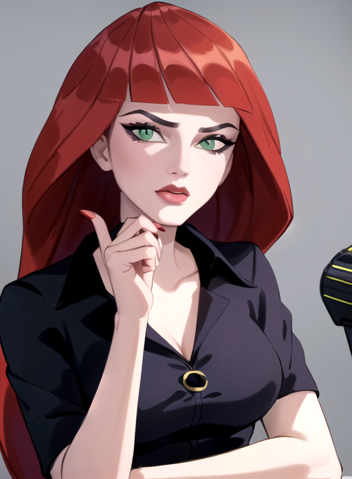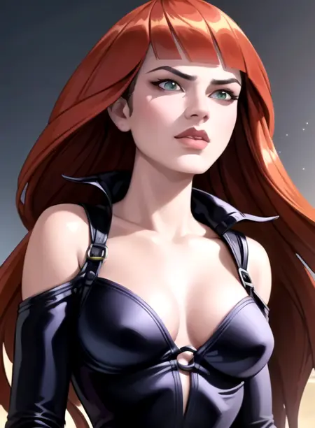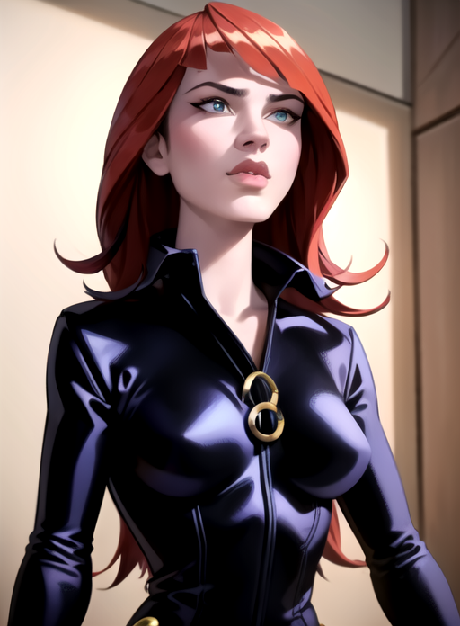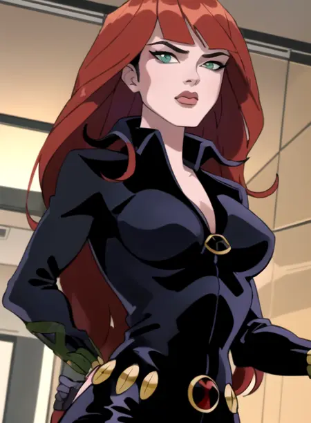 blackwidow, long hair, red hair, green eyes, makeup, lipstick