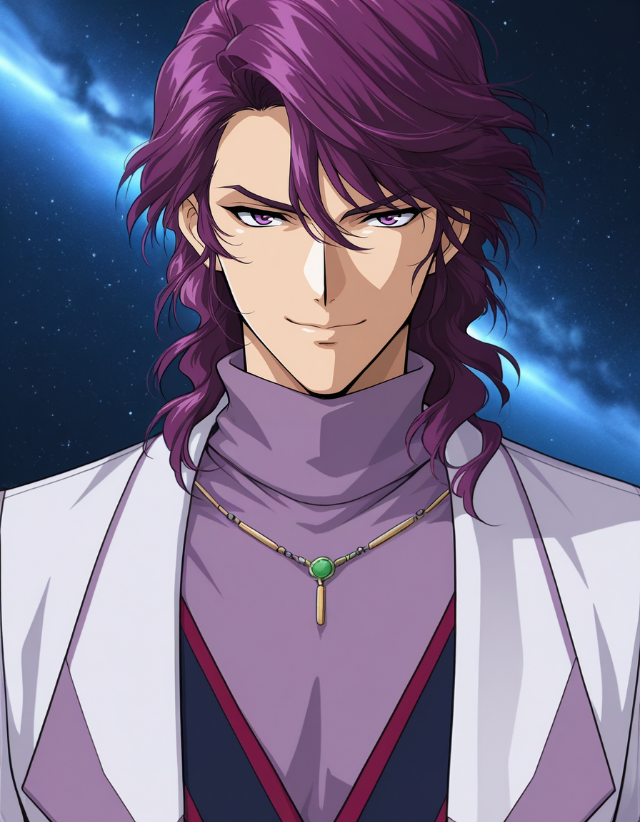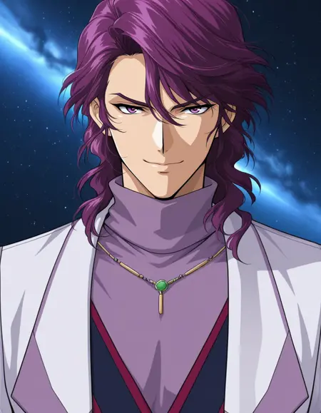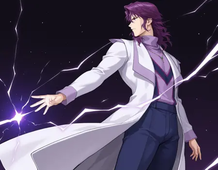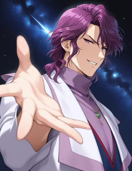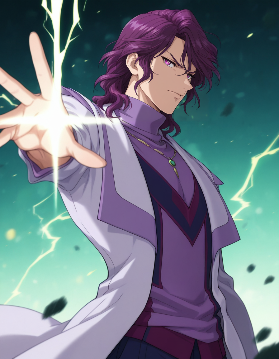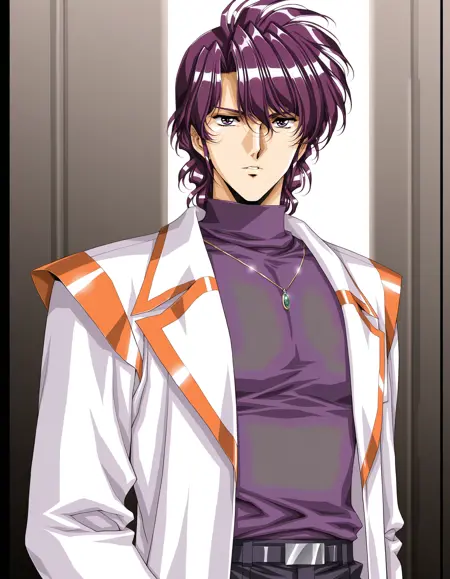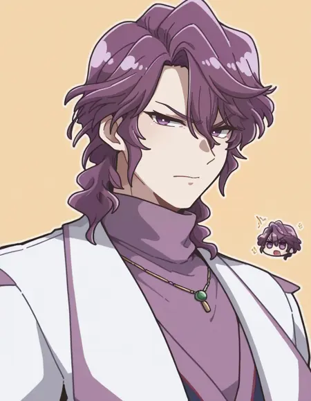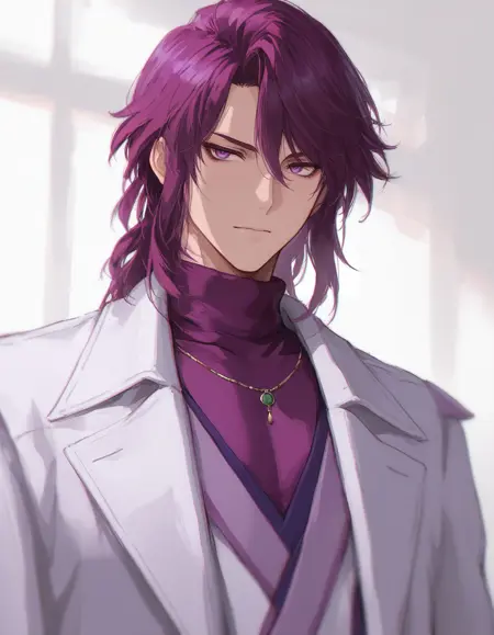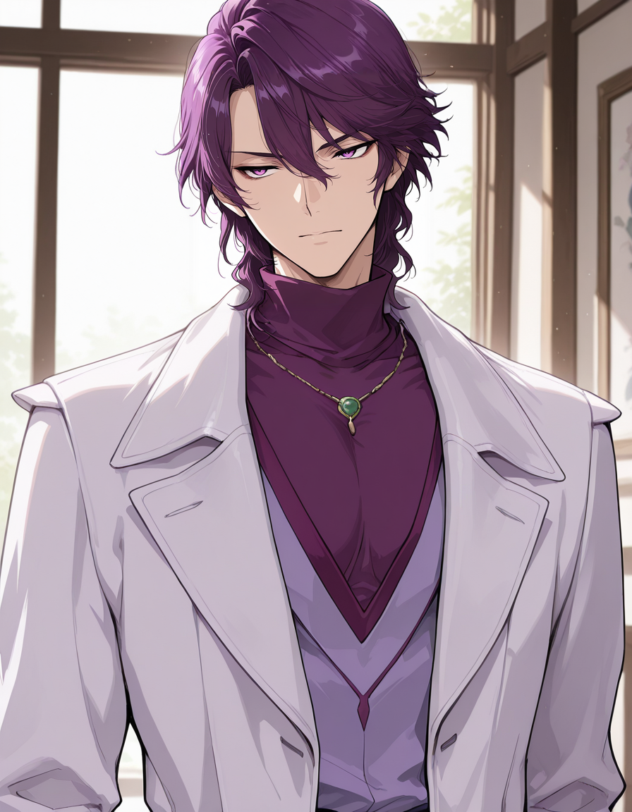 mai_shu_shirakawa, male_focus, purple_hair, purple_eyes, , hair_between_eyes, v-shaped_eyebrows, purple_shirt, turtleneck, necklace, coat,blue_pants,shose,white_footware