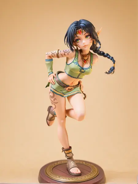 Outfit Words: "black hair, braid, tattoo, green eyes, midriff, green shirt, navel, miniskirt, necklace, earrings, circlet, bare shoulders, pointy ears, elf, jewelry"