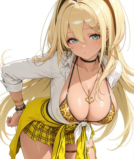 yellow nails, nail polish, shirt, long sleeves, jewelry, jacket, school uniform, white shirt, swimsuit, bikini, open clothes, choker, bra, bracelet, black choker, open shirt, animal print, front-tie top, bikini under clothes, checkered clothes, yellow bikini, tied shirt, leopard print,
