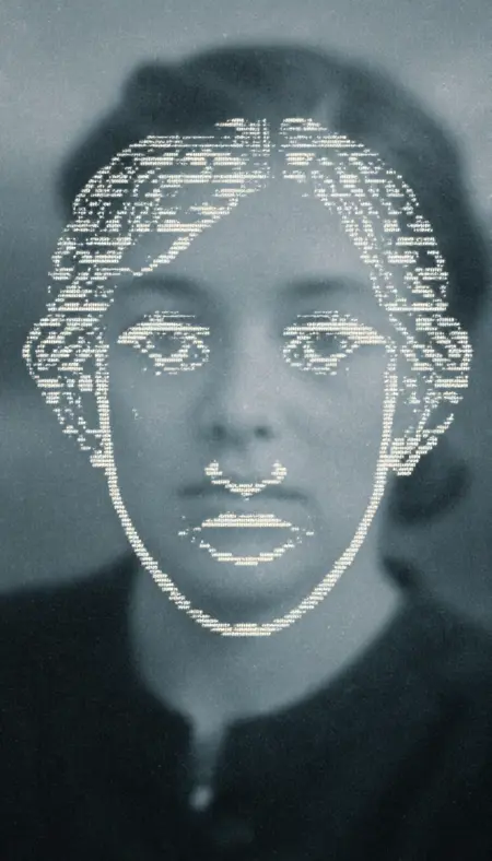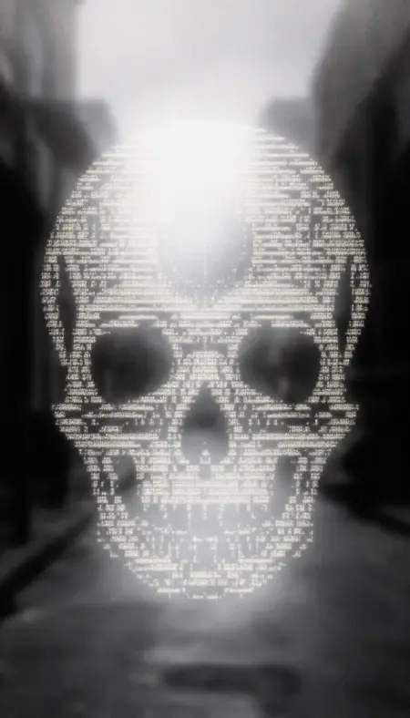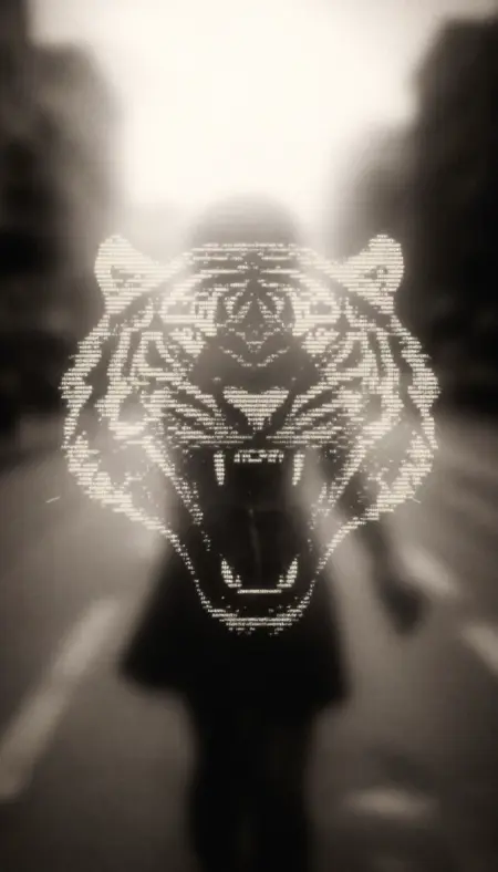 都市街で叫ぶ女性の白黒写真。オーバーレイ:ASCIIアートスタイルの小さな白い文字で構成された虎の顔(口を開けた状態)。