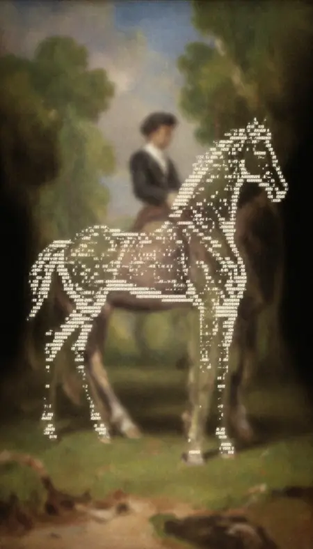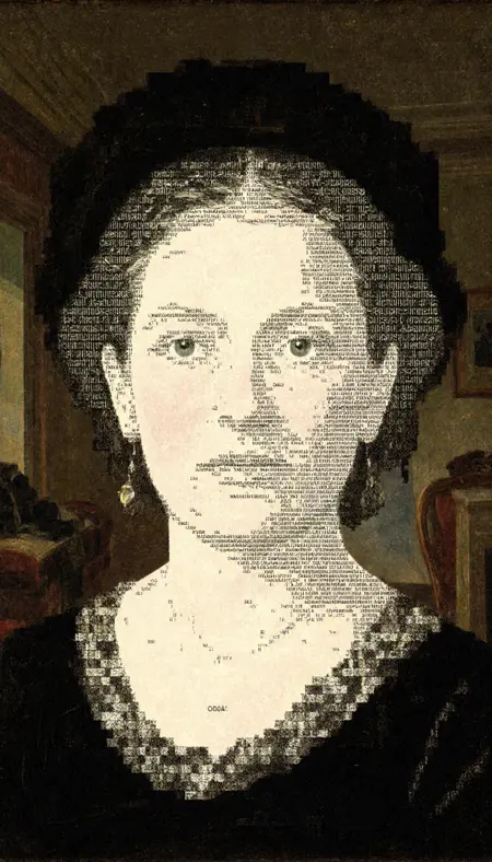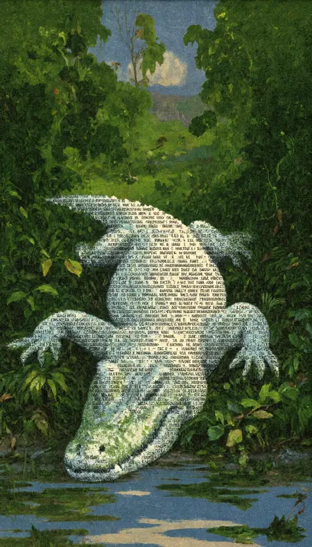 多数の小さな白い文字で構成された[対象]のASCIIアート。背景:[スタイル]。オプション:overlay。
