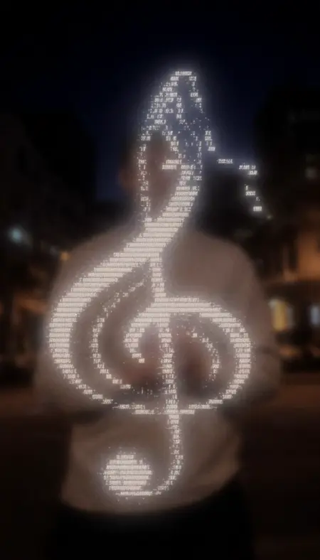 対象は、多くの小さな白い文字(ASCIIスタイル)で輪郭を形成しています。以下のような形が可能です: