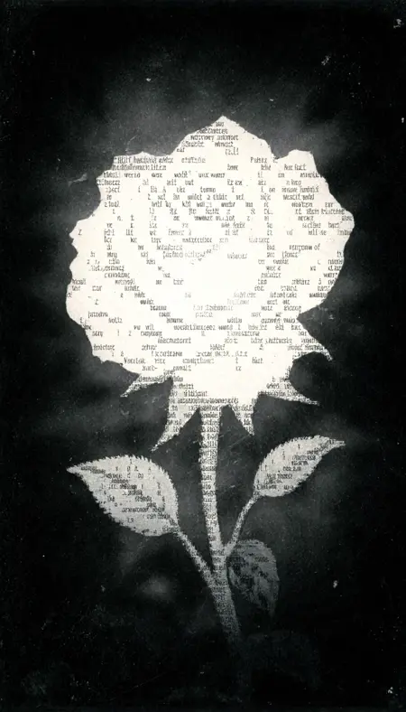 主な対象は、黒い文字とアルファベットで構成された白い形状として表示されます(「装飾された」ものではなく、形はテキストそのもので作られています)。