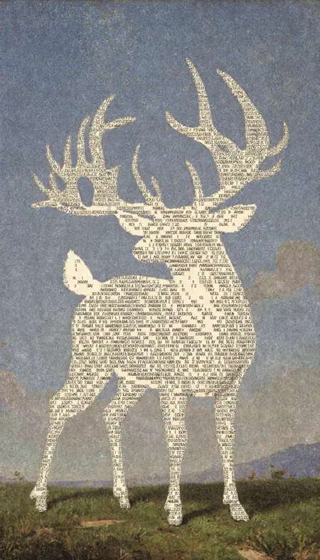 鹿の形をしたワードクラウド。輪郭はさまざまなサイズと向きの文字と単語で構成されています。背景:油絵、高コントラスト。