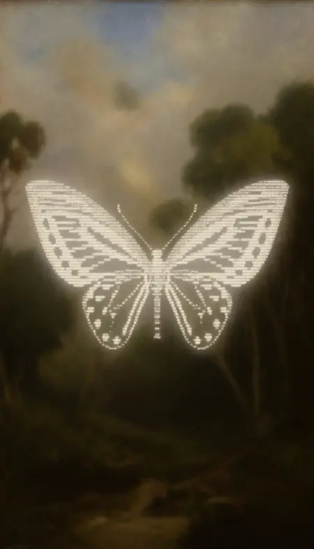 白い文字で構成されたASCIIアートの蝶。背景:ぼかした油絵風の森。