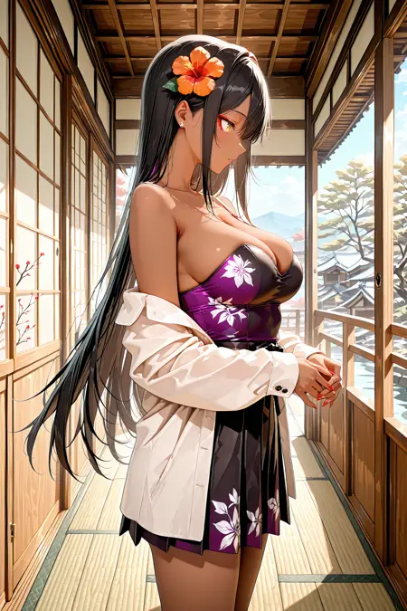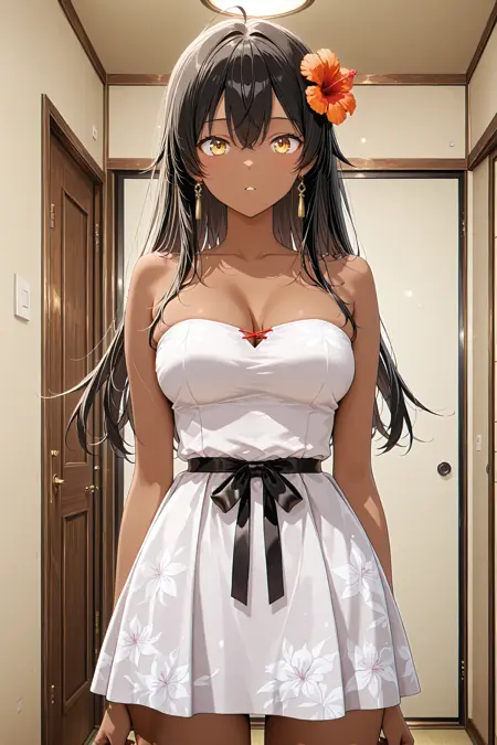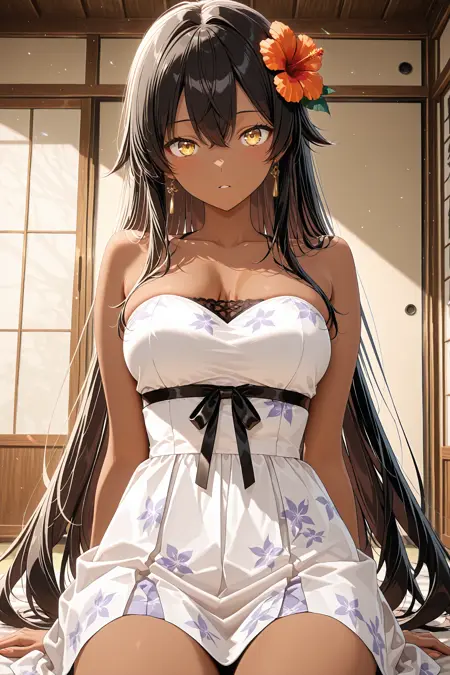 不幸的是,如果你不希望她肤色偏白,可能还需要添加dark-skinned_female或dark_skin标签。这仅仅是Illustrious模型在训练中无法克服的固有偏差。此外,你可能还需要添加“purple_dress”标签,因为不知为何,模型 otherwise 倾向于生成黑色裙子。