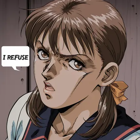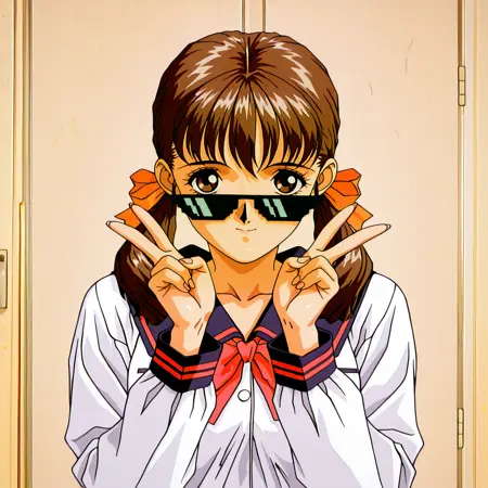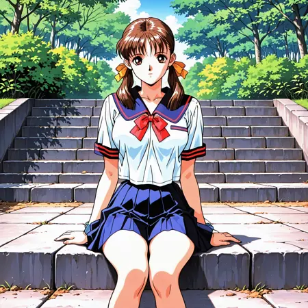 Trigger words and recommended prompts: COOLAYANA07, 1girl, retro artstyle, 1990s \(style\), umetsu yasuomi, brown eyes, brown hair, low twintails, hair ribbon, serafuku.