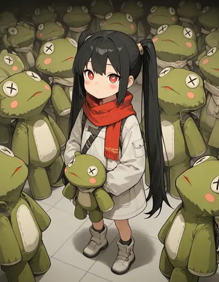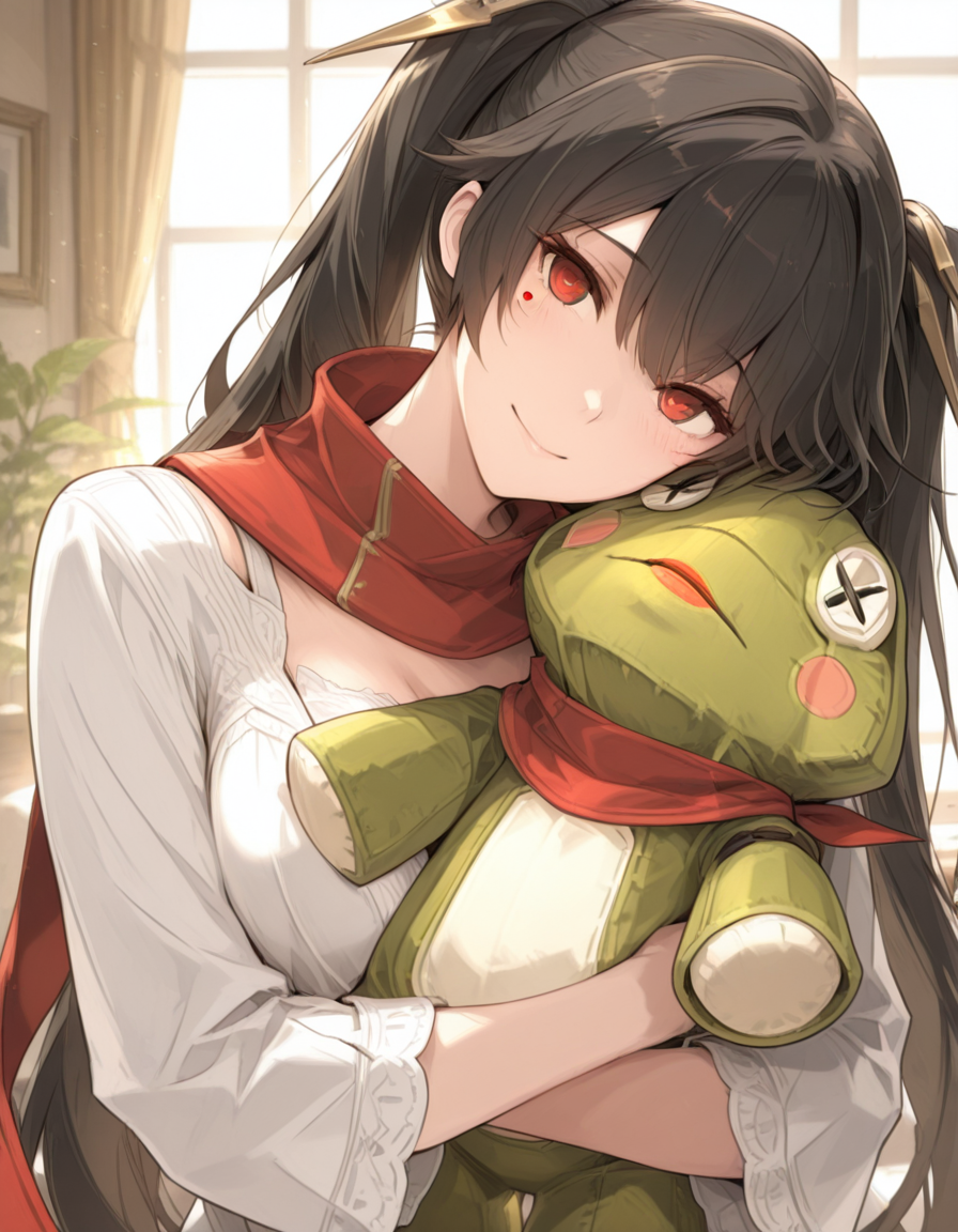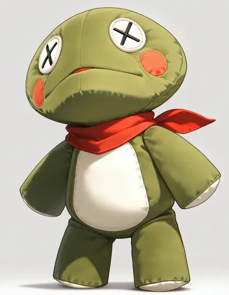 mai_pgradw,solo,blush_stickers,stuffed_toy,stuffed_animal,frog,red_scarf,x_x,button_eyes