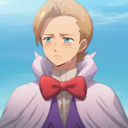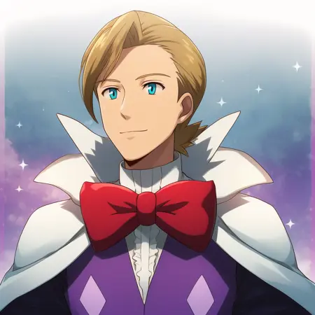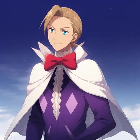 1boy, blonde hair, blue eyes, white cape, red bowtie, center frills, white gloves, purple shirt, long sleeves,