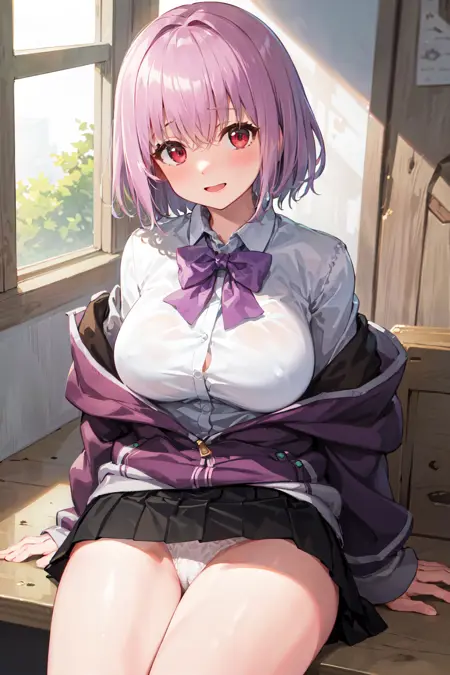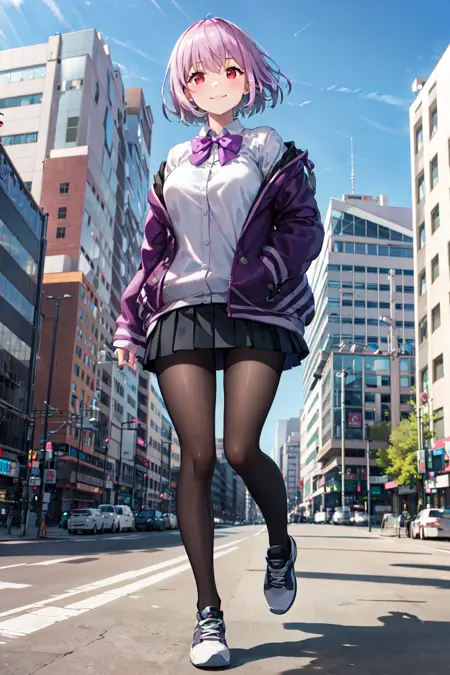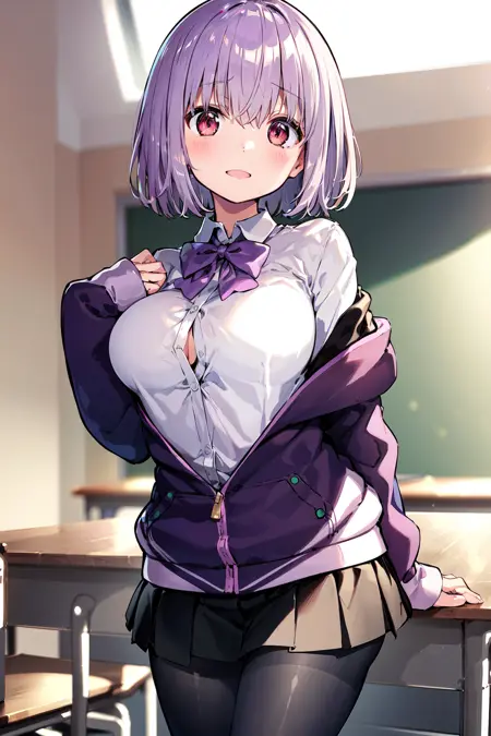 aaakane, short hair, red eyes, large breasts, purple bowtie, collared shirt, white shirt, off shoulder, purple jacket, partially unzipped, long sleeves, sleeves past wrists, pleated skirt, black skirt, pantyhose