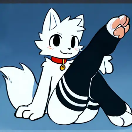 프롬프트: boykisser, 페르리, 흰색 페르리, 소년, 2d, boykisser의 스타킹, 빨간 목줄, 앤트로, 타이트한 스타킹