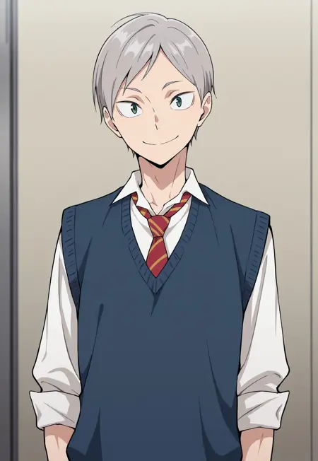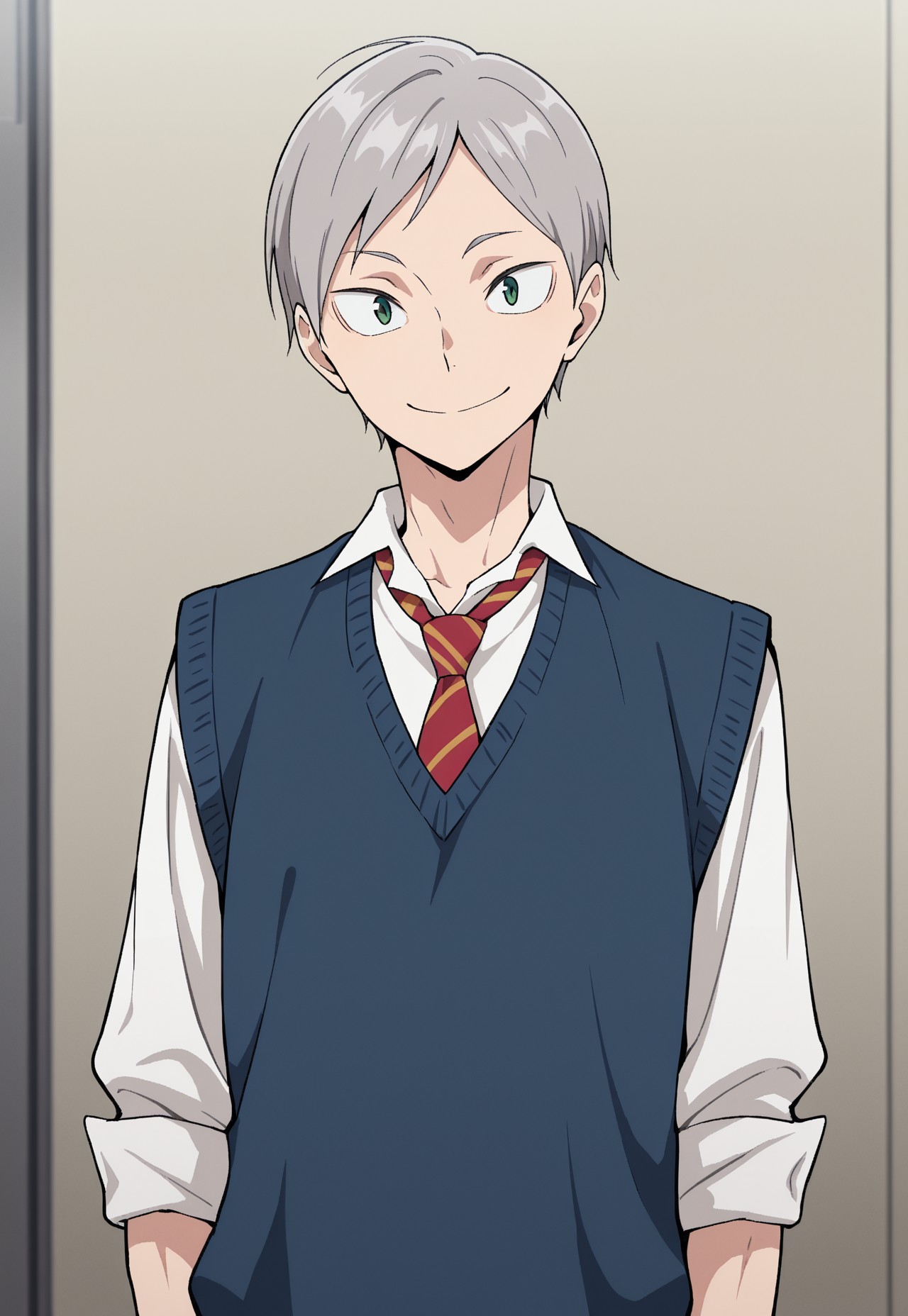 1个男孩,男性焦点,单人,绿色眼睛,灰色头发,校服,白色衬衫,有领衬衫,红色领带,条纹领带,针织背心,黑色背心,袖子卷起,