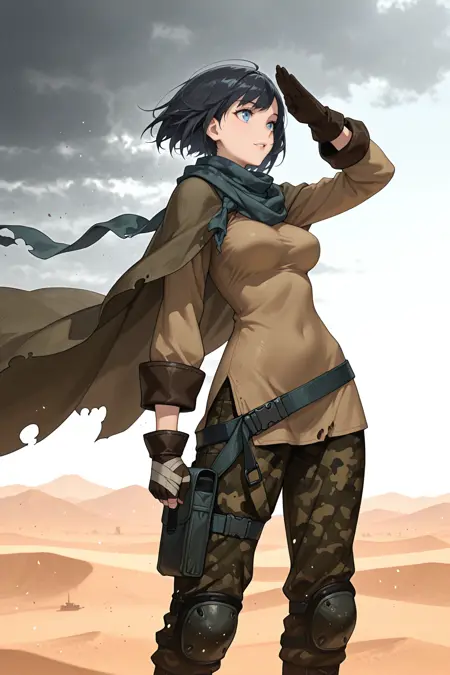 触发词(带兜帽):jckas,短发,黑发,头发遮住一只眼睛,蓝眼睛,兜帽斗篷,帽子拉起,破烂衣物,围巾,棕色衬衫,长袖,手套,单手包扎,松垮腰带,大腿口袋,迷彩裤,大腿绑带,护膝,靴子