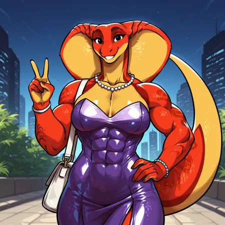 긍정적 프롬프트: RubyZM, 펄리 여성, 앤트로, 스케일, 뱀, 코브라, 진한 빨간 눈썹, 검은 눈, 빨간 몸, 빨간 비늘, 노란 몸, 노란 비늘, 이색 몸, 이색 비늘, 근육질 여성, 중간 크기의 가슴, 복근, 빨간 꼬리, 노란 꼬리, 다색 꼬리, 긴 꼬리