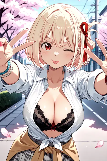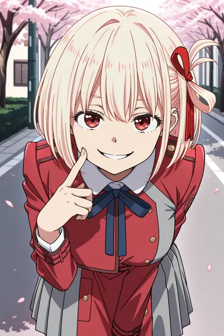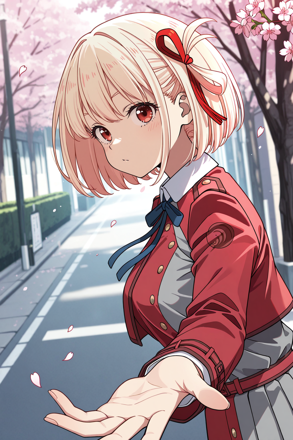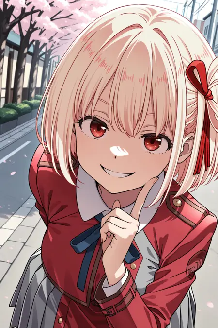nishikigi chisato, red eyes, blonde hair, red ribbon, hair ribbon, one side up, bob cut, short hair