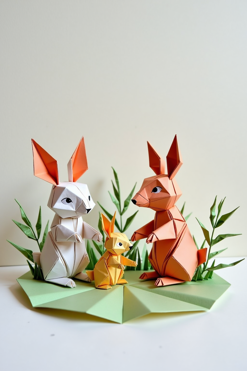 紙素材を使った折り紙アート、かわいい動物の家族を作成、ウサギ、クマ、優しい折り目、パステルトーン、紙でできた牧場で遊ぶ、温かく甘い雰囲気。