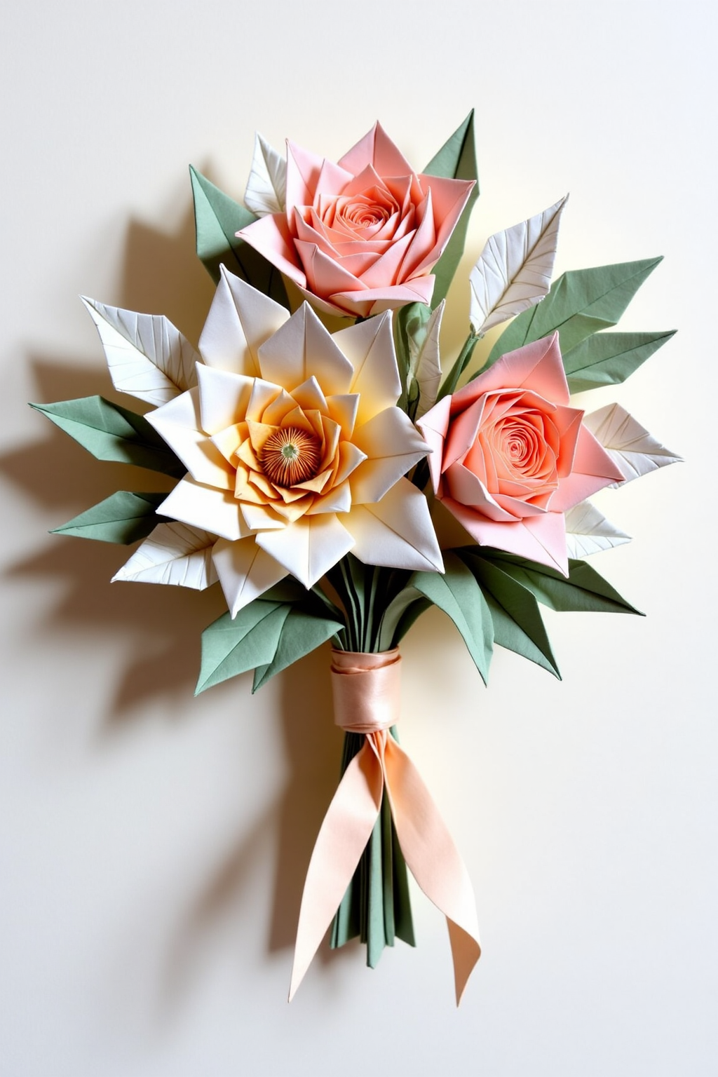 紙素材を使った折り紙アート、繊細な花束をデザイン、多様な花々、柔らかな色調、リアルな花びらの折り目、サテンリボンで結ばれ、ロマンチックなシーン向け。