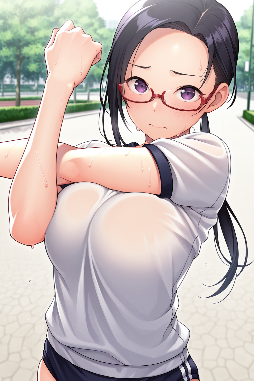 satou sakie, 紫色の目, 黒髪, 低いポニーテール, 赤枠の眼鏡