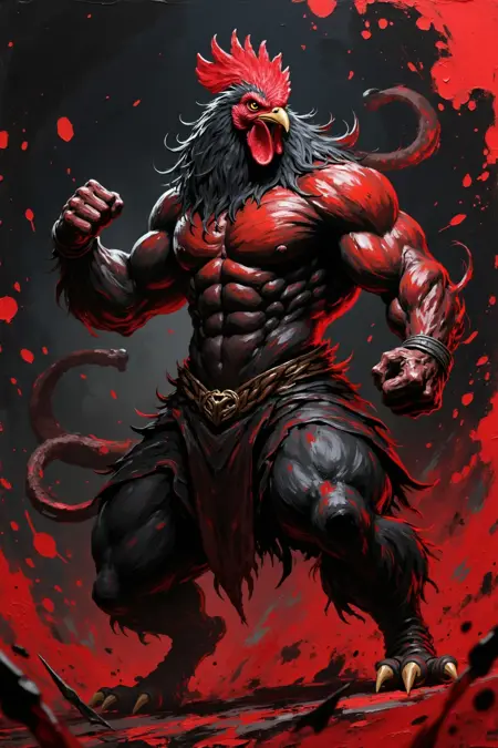 深色调搭配红色泼溅与肌肉发达的兽化人形,呈现鸡人形象。利爪双手,羽毛细节,大胆笔触,强势站姿。