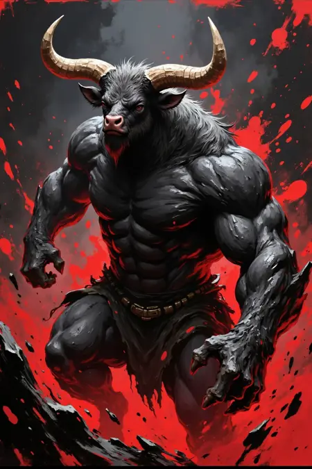 深色调搭配红色泼溅与肌肉发达的兽化人形,呈现牛人形象。巨大犄角,坚实身躯,深红色调,沉稳力量。