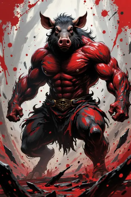 深色调搭配红色泼溅与肌肉发达的兽化人形,呈现猪人形象。魁梧体格,长牙鼻吻,混乱红色溅点,原始力量。