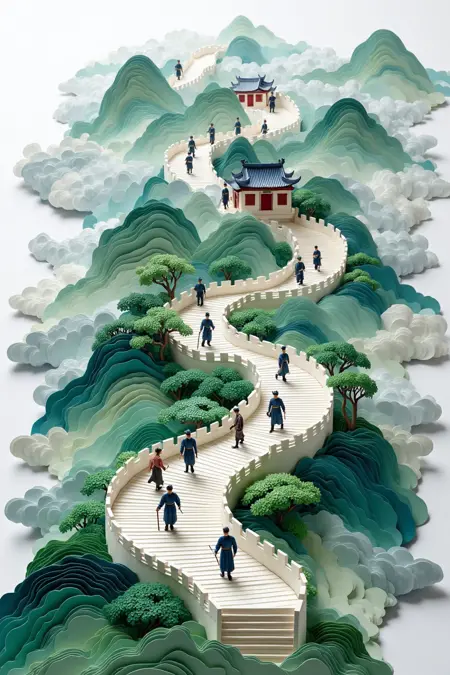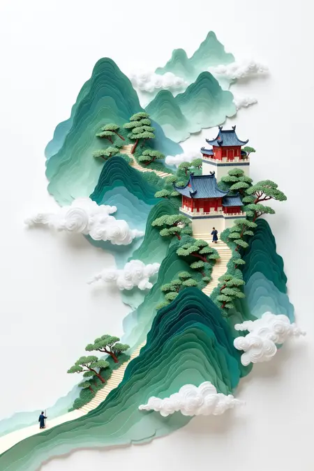 Paper - cut art with Chinese landscape elements, illustrating a steep mountain with a temple on top, a pilgrim climbing, cascading clouds, deep green and white.