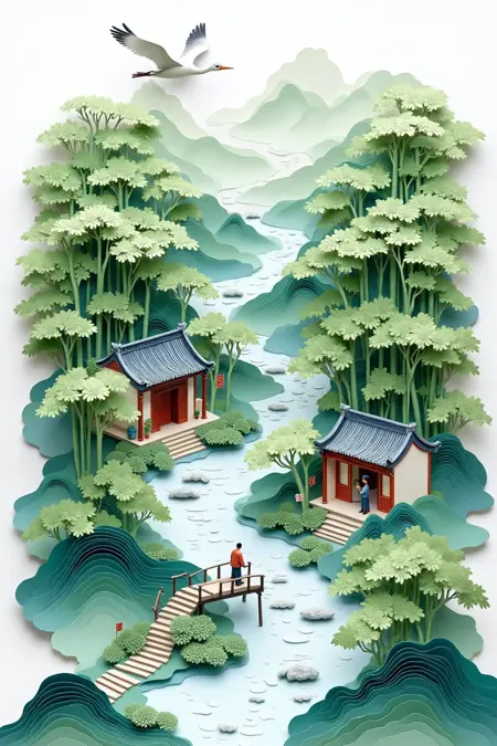 **Base Prompt:**Paper - cut art with Chinese landscape elements