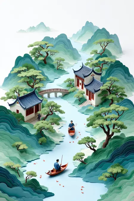 Paper - cut art with Chinese landscape elements, featuring a river flowing past traditional houses, lush trees, and a fisherman in a small boat, vibrant greens and blues.