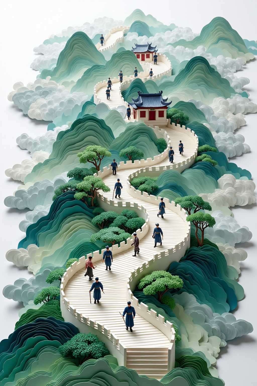 Paper - cut art with Chinese landscape elements, depicting a great wall section winding over mountains, soldiers marching, clouds swirling, strong green and gray hues.