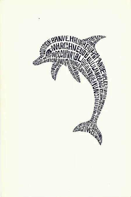 Composed of words, design a playful dolphin, words shaping its body and fins, leaping from a word - ocean surface.