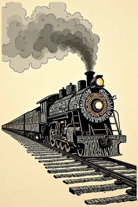 Composed of words, design a retro - style train, words shaping carriages and tracks, with a smoky, industrial - feel sky.