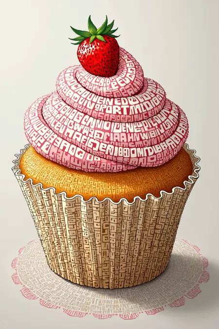 Composed of words, make a lovely cupcake, words as icing, cake, and wrapper, on a sweet, word - patterned table.