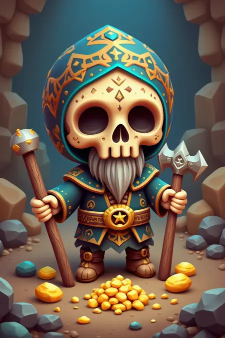 スカルテーマのカートゥーンキャラクター、鉱夫として、鉱山のツルハシを持ち、鉱石の山、粗いテクスチャー、土色系の色調。