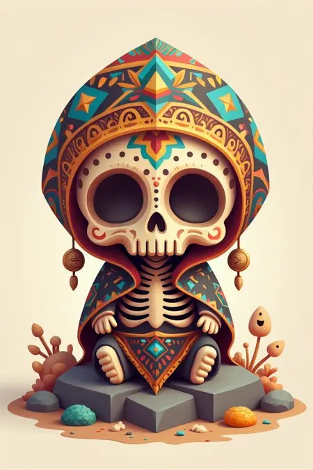 スカルテーマのカートゥーンキャラクター、民族衣装を着て、部族模様が施され、石の上に座り、シンプルなシェーディング、温かみのあるトーン。