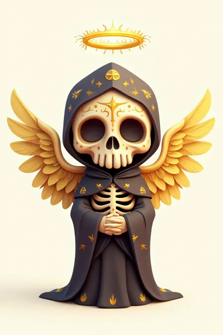 スカルテーマのカートゥーンキャラクター、天使として、金色の翼を持ち、聖なるローブを着て、やわらかな光、明るい背景。