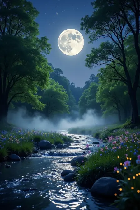 Moonlit riverside natural scenery, mist swirling over the water, ancient trees casting long shadows, faint glow from hidden fireflies.