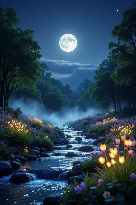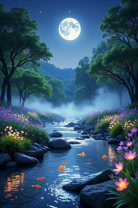 Moonlit riverside natural scenery, glowing fish swimming in the clear parts, fragrant blossoms filling the air, constellations mirrored in the water.