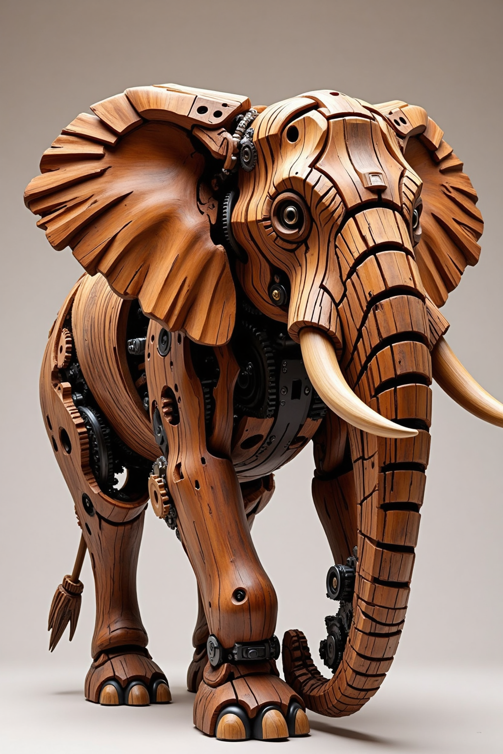 나무 질감과 기계 요소의 결합, 단단한 코끼리를 구축하세요. 거대한 나무 몸체, 기계로 구동되는 코뿔과 코, 기계식 발을 장착하고, 사바나 스타일의 장면을 구성하세요.
