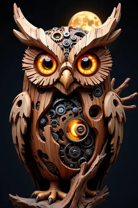 나무 질감과 기계 요소의 결합, 신비로운 올리브를 디자인하세요. 깃털 무늬는 나무로, 눈과 날개에는 기어가 가득하고, 야간 기계식 발광 효과를 주며, 달빛이 비추는 나무를 배경으로 하세요.
