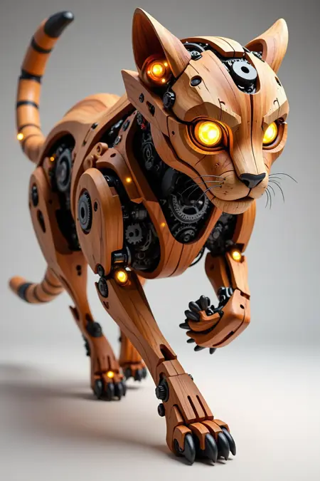 나무 질감과 기계 요소의 결합, 빠른 치타를 디자인하세요. 유선형 몸체는 나무로, 팔다리와 얼굴에는 기어가, 발광하는 기계 액센트를 추가하고, 역동적인 달리기 자세를 표현하세요.