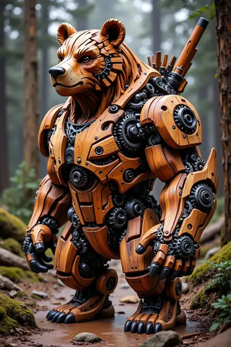 나무 질감과 기계 요소의 결합, 강력한 곰을 제작하세요. 거친 나무 표면, 큰 기어로 구성된 발, 기계식 코를 지니고, 숲을 연상시키는 배경을 사용하세요.