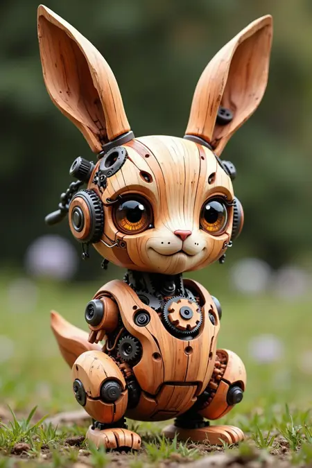 나무 질감과 기계 요소의 결합, 활기찬 토끼를 형성하세요. 섬세한 나무 구조, 기어로 세밀하게 표현된 귀와 발, 귀여운 기계식 얼굴, 초원 배경을 사용하세요.
